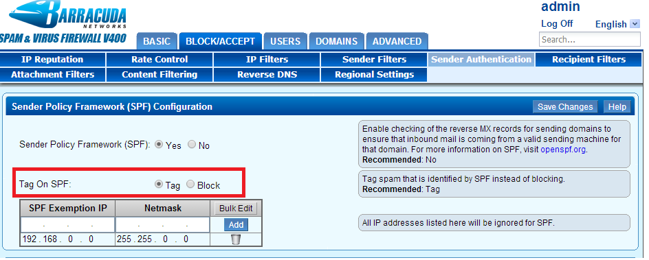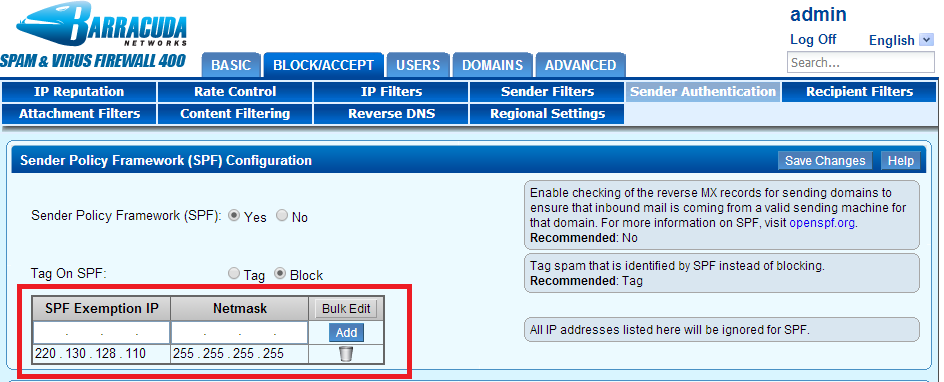 但實際使用此功能時,不少系統管理員都會忘記那些IP是公司會發送信件的IP,造成公司發送信件出去後被有開啟SPF的MTA給封鎖了,甚至還會被認為設備怎麼這麼容易誤判,真是辜負當初設計SPF的用意了,所以為了解決這一個問題,目前Barracuda SPAM有兩種方式