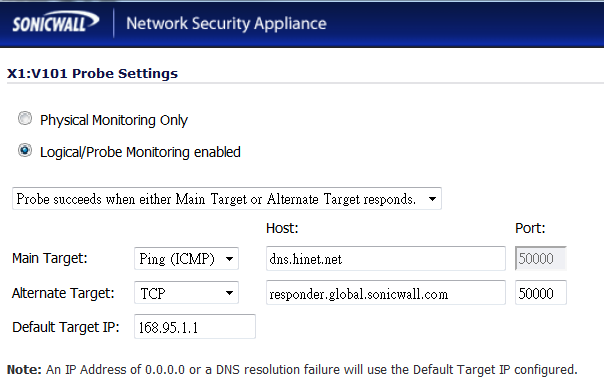 Note: Default Target IP :當SonicWALL DNS無法解析時,則使用 Default Target IP來檢查WAN線路運作是否正常