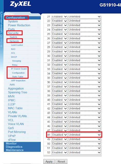 Configuration >> Security >> Network >> IP Source Guard >> Configuration